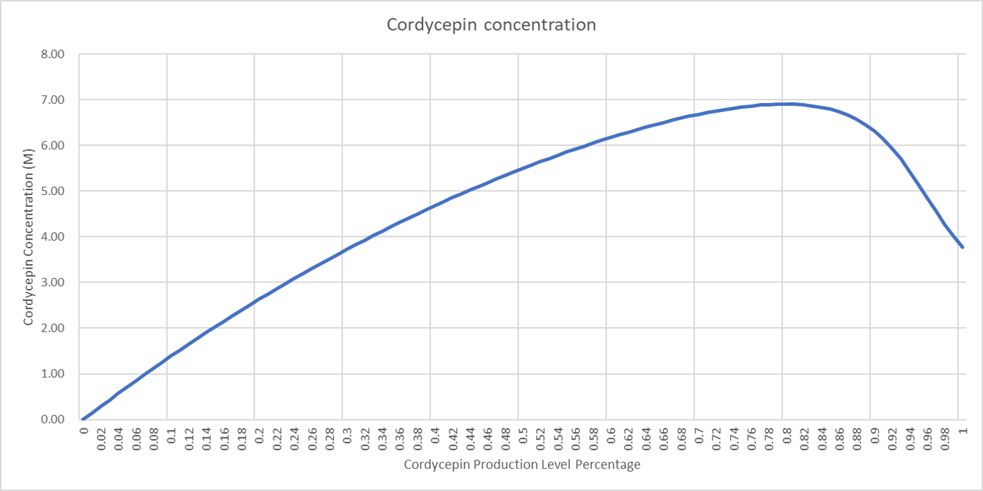 Since the goal of our project is to increase the efficiency and yield of cordycepin production, this result is helpful to the manufacturing. Although the parameters are set optional owing to lack of information, it will give a brief guideline of the optional ratio of cordycepin and pentostatin and will benefit the factories a lot when the enzymatic parameter is provided.